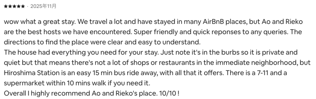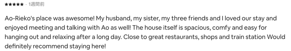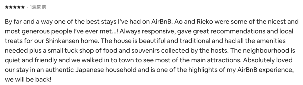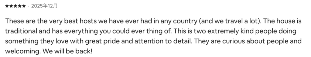 | Privacy プライバシー | Entire house rental (host may visit for trash collection) 完全貸切(ゴミ回収時のみ対応あり) | Host lives on-site(You will not share the space with other guests.) ホスト居住型(他のお客様と一緒になることはありません) |